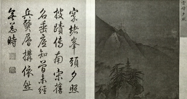 The recognition of the aberrant sites had been anticipated at the beginning of the seventeenth century. In 1609, Yang Erzeng 楊爾曾, also known as the Dream-Traveling Daoist of Qiantang (Qiantang woyou daoren 錢塘卧遊道人), compiled and published the Strange Views Within the [Four] Seas (Hainei qiguan 海內奇觀). According to Yang, he was motivated by a desire to educate the armchair traveler: 'There are metamorphoses of clouds, fogs, winds, and thunders under the blue sky and the bright sun; there are strange and weird people, creatures, and plants in the sandy region of the Ganges River. The mountains and rivers yonder are truly quaint and unpredictable. ... [I] have therefore marked them out to show what one's eyes and ears cannot reach.'[57] The book includes a woodblock print of the 'Leifeng Pagoda at Sunset,' presumably as a specimen of 'the truly quaint and unpredictable.' Two young scholars, accompanied by an old rustic, stand at the foot of the pagoda and look up, apparently riveted by the spectacle of this ruined pagoda. Behind the scholars, two attendant boys are busy laying out inkstones and other instruments so that their masters can write down their thoughts on the spot.[Fig.8] The print visually makes a case for the pagoda as a topos: visit to the site occasions writing about it. Yang Erzeng matches the print with a poem on the same subject by Mo Fan, 莫璠, a mid-Ming writer [Fig.9]: